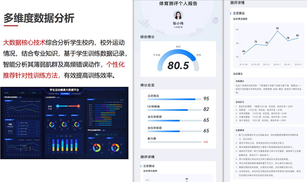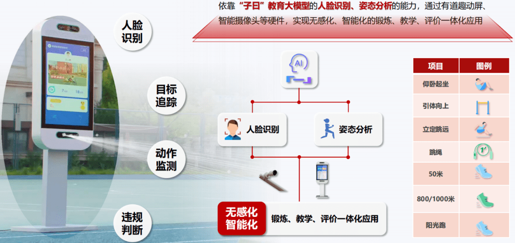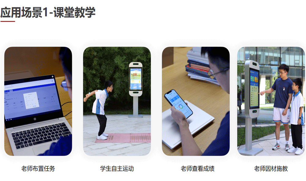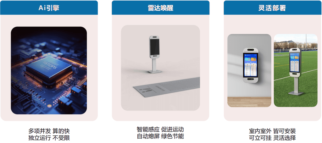 采用“云-边-端”网络架构,通过摄像头、一体化运动屏等智能终端,实时、多排度的采集学生运动数据。基于摄像头+A|运动视觉系统以及一体化交互终端,无需二次调试,无需佩戴设备,即可实现无感、智能化的锻炼、教学、评价一体化,覆盖引体向上、立定跳远、仰卧起坐、实心球、跳绳、中长跑等多项体育运动场景。